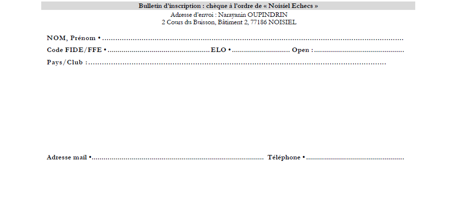 S'inscrire avec le Bulletin d’inscription par chèque à l’ordre de « Noisiel Echecs »