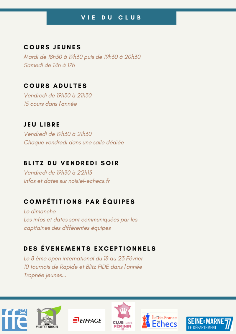 - 9 septembre, reprise du jeu libre de 19h30 à 21h30. Il sera possible de rencontrer le président et de finaliser vos inscriptions.